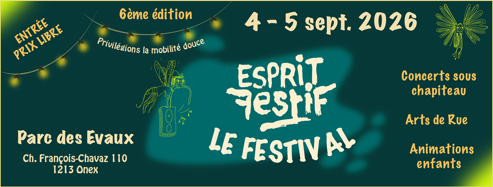 Après deux années consacrées à la recherche d’un nouveau lieu, Esprit Festif le Festival est de retour les 4 et 5 septembre 2026 au Parc des Evaux. Soutenus par la Fondation des Evaux, l'association Esprit festif installera son chapiteau dans ce cadre exceptionnel, au cœur d’un parc qui se prête parfaitement à l’esprit convivial et ouvert du festival.
